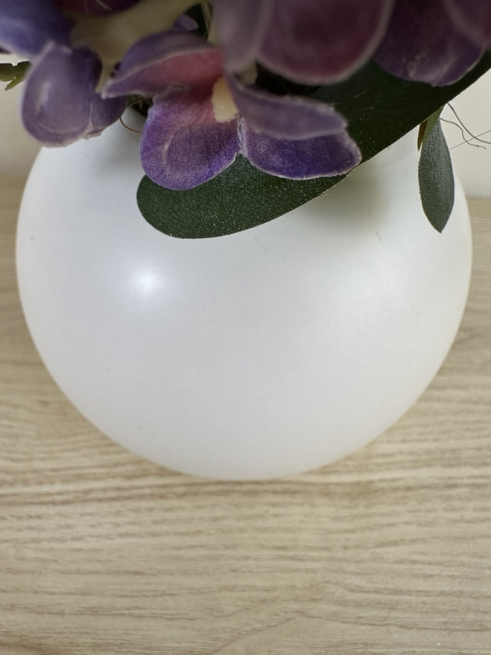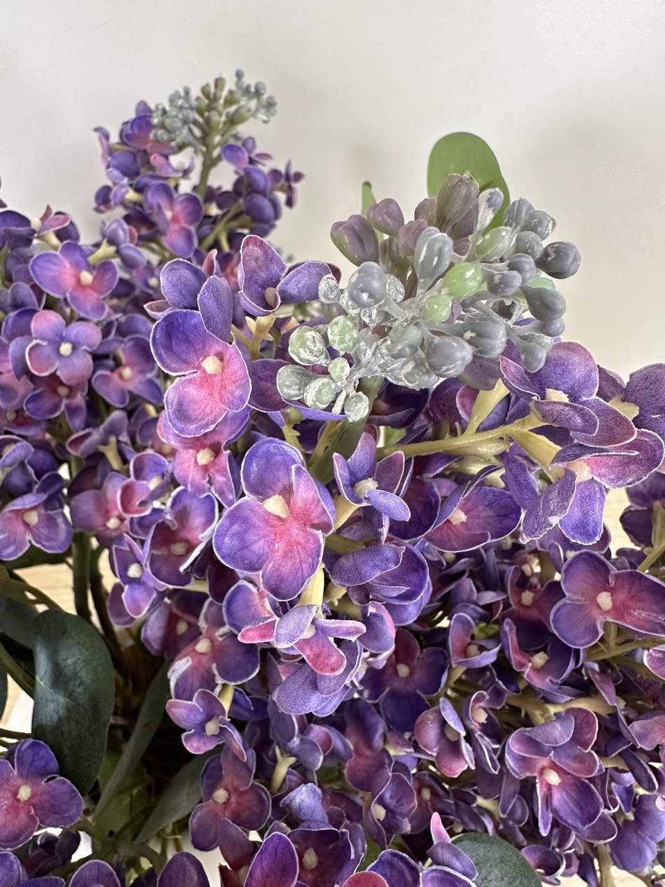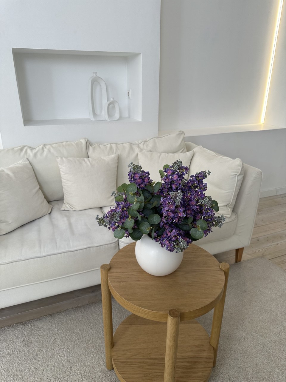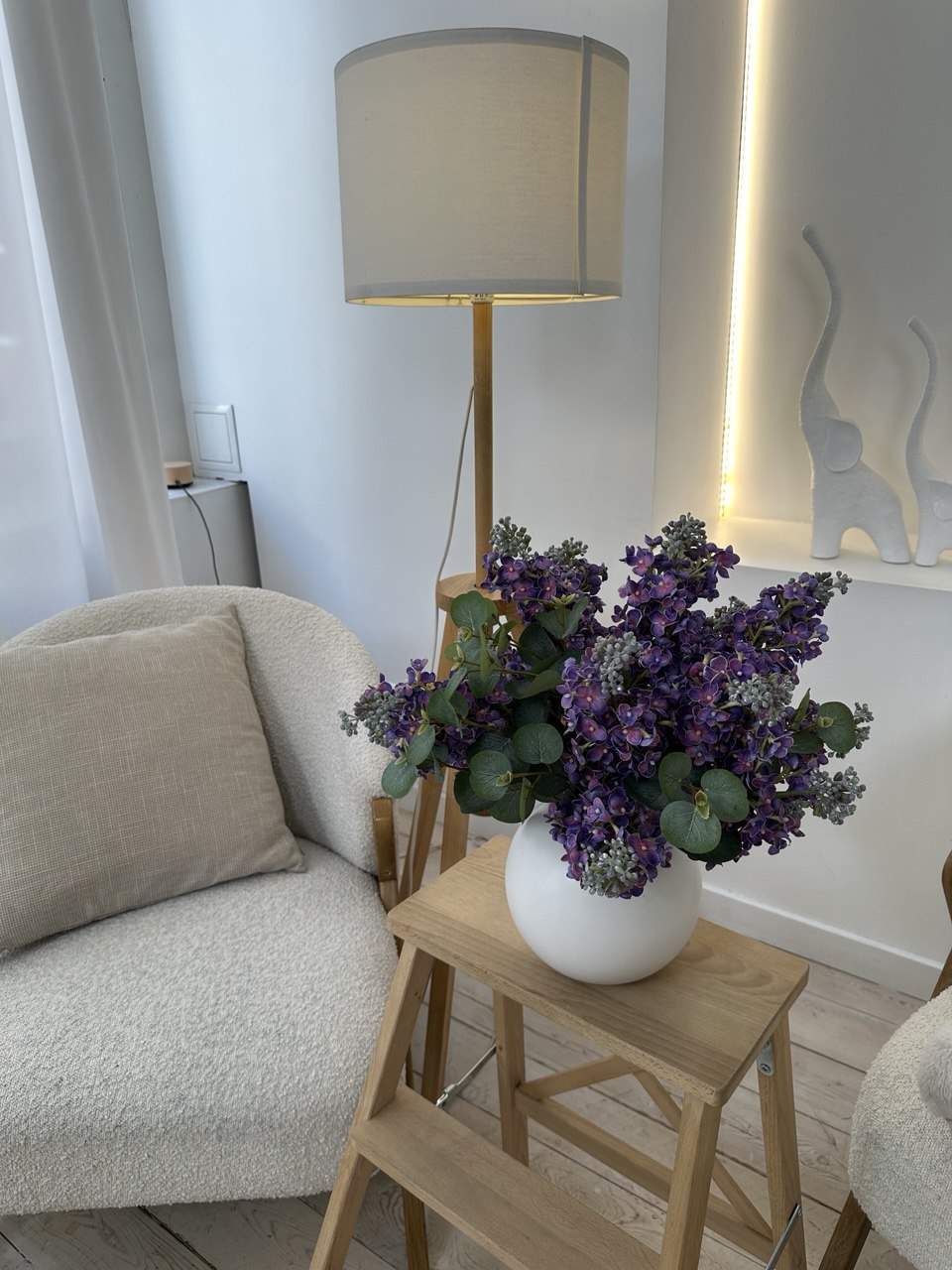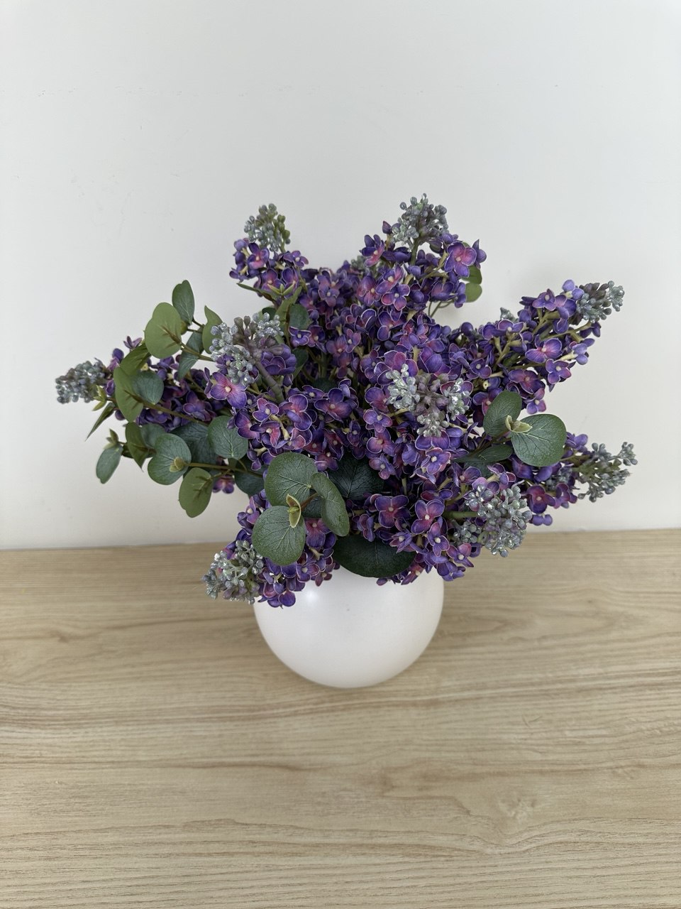 Композиция с сиренью и эвкалиптом в белом кашпо, в- 44 см
