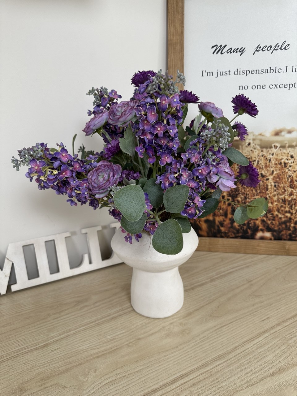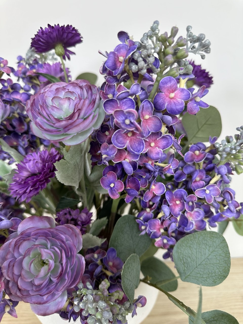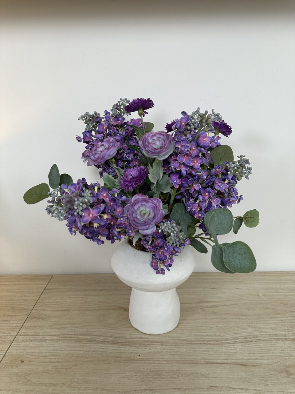 Композиция с сиренью и ранункулюсами в белой вазе , в-50 см